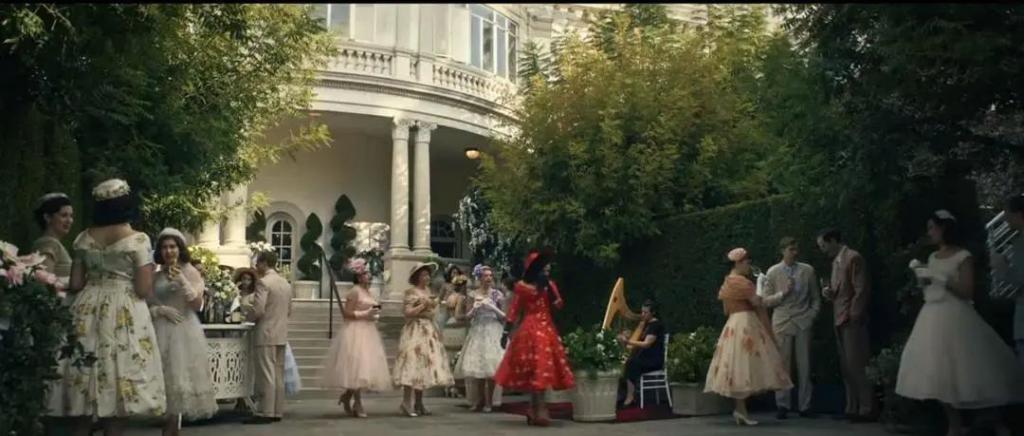 同时," 新风貌 " 设计也冲出欧洲,成为美国上流阶层茶歇和舞会的热门着装。比如故事发生在 1949 年的《致命女人 2》中,在豪宅女主人 Rita 的花园茶会里," 新风貌 " 是女人们的标配。