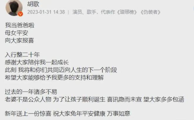 胡歌忽然在 2025 年 1 月 31 日发了一条微博,官宣自己结婚有了女儿,当爸爸了。