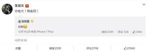 日前,朱亚文妻子沈佳妮在接女儿时,因衣着宽松被疑怀有二胎。今晚,@沈佳妮 在微博上发了“哎哟”俩字,还配了个“害羞脸”的表情,疑承认怀有二胎。随后,@朱亚文 转发妻子微博,称:“你老大!我老四!”坐实二胎消息。恭喜二位啦!
