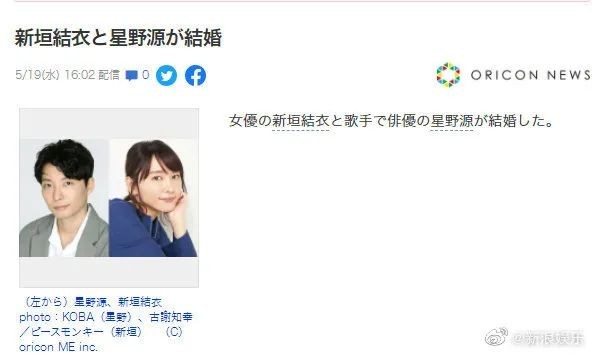 日本女星新垣结衣与星野源通过事务所公布结婚喜讯,