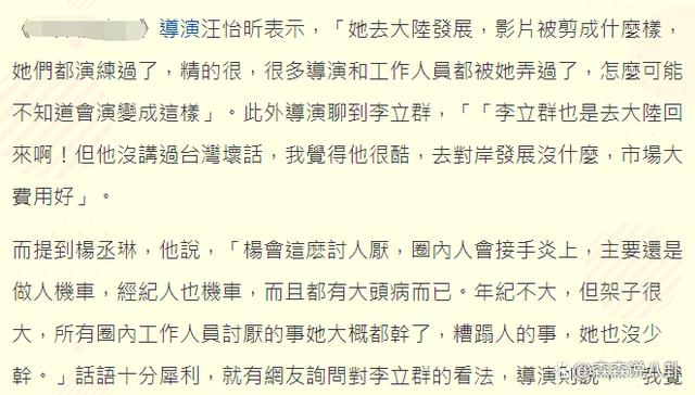 一名叫汪怡昕的台湾导演,指杨丞琳在台湾演艺圈混不下去才跑去大陆发展,还说她的人品很差,人精得很,很多导演和工作人员都被她弄过,又指杨丞琳人很机车,经纪人也很机场,年纪不大架子很大,所有圈内人士都讨厌的事,杨丞琳大概都干了,糟蹋人的事,也没少干。