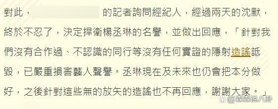 经纪人回应道:" 针对我们没有合作过、不认识的同行等没有任何实证的隐射造谣诋毁,已严重损害艺人声誉。丞琳现在及未来也仍会把本分做好,之后针对这些无的放矢的造谣也不再回应,谢谢大家。"
