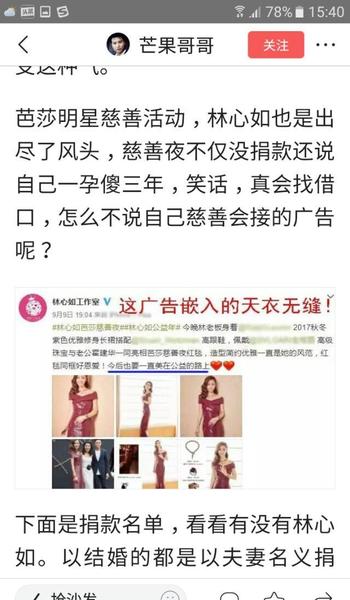 林心如参加芭莎慈善分文不捐,还相反乘机宣传自己的珠宝产品打广告,蹭热度事件: