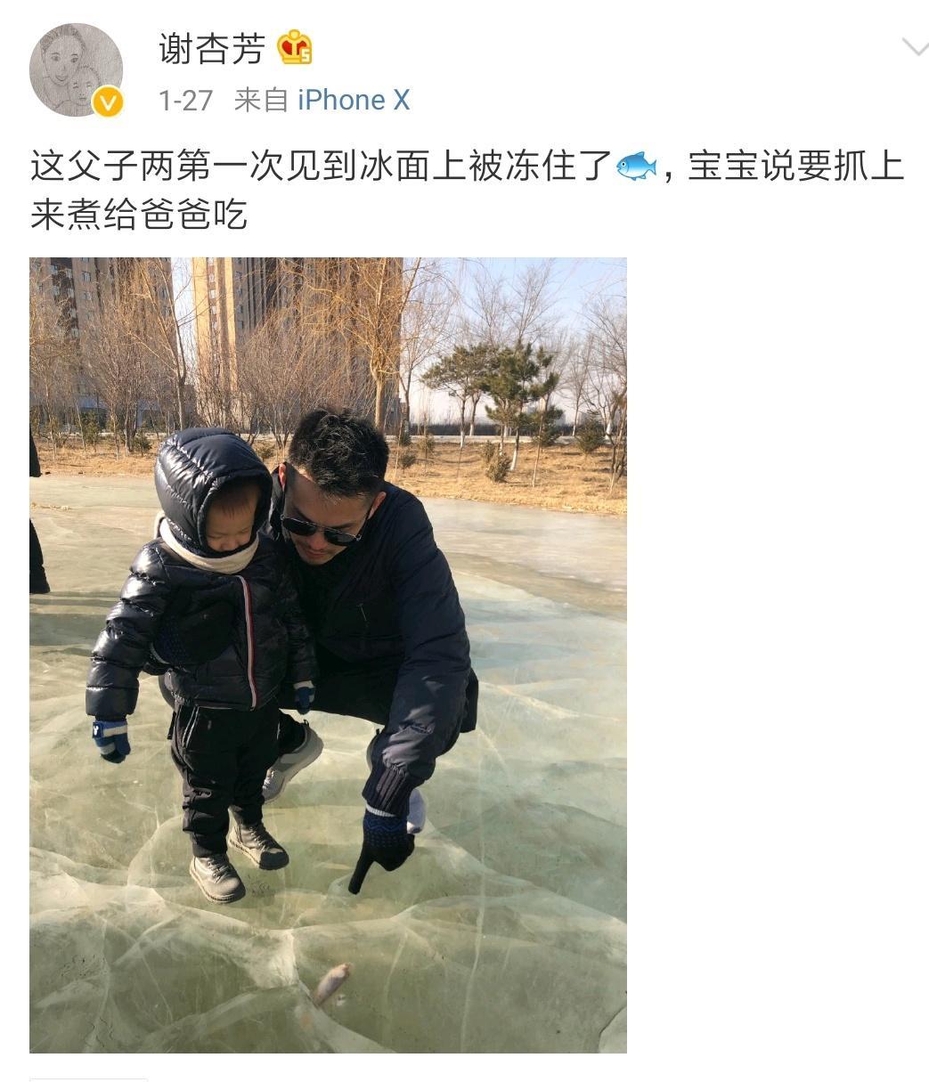早在今年1月,谢杏芳就晒出林丹和儿子在冰面上玩耍的照片,并配文:宝宝说要抓鱼来煮给爸爸吃。