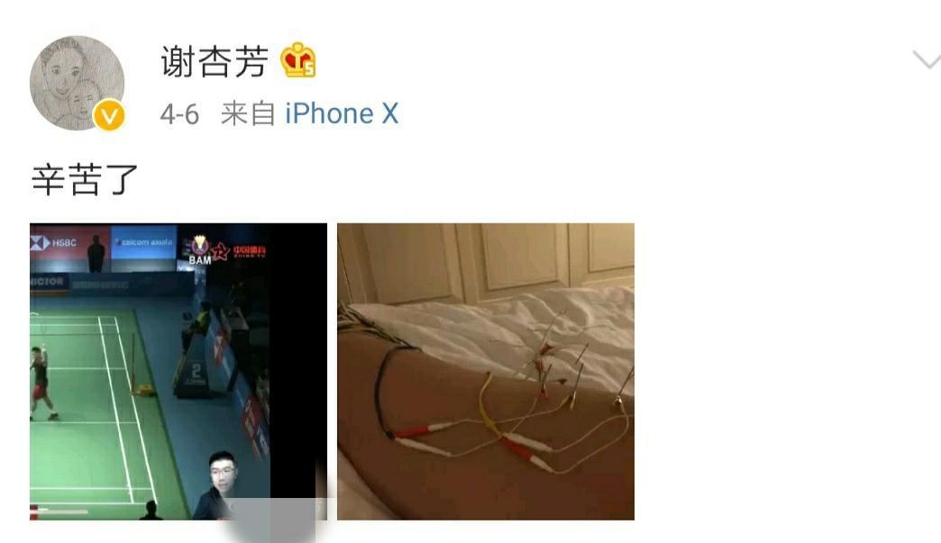 今年4月份林丹参加比赛,谢杏芳晒出了图片,第一张很显然是在电视前拍下的林丹打球的照片,第二张是林丹腿部在做治疗的图片,还贴心的配文:辛苦了。毫无疑问,谢杏芳很担心林丹。