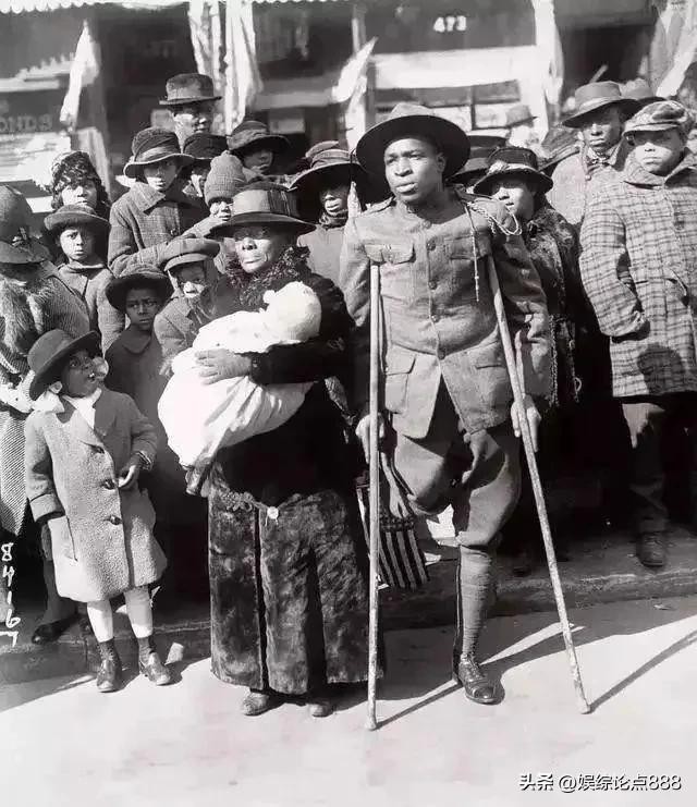 1918 年,美国纽约街头,一名士兵身着戎装,拄着双拐,在战争中失去一条腿,与母亲相依合影,画面满是温情。