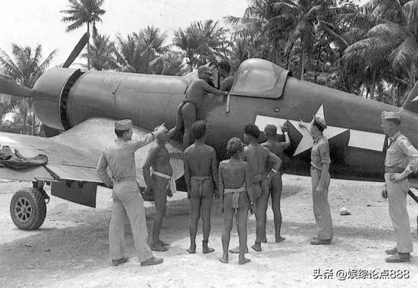 二战时,太平洋某海岛之上,土著居民满脸敬畏,团团围聚,目不转睛地打量着一架 F4-U“海盗”战机。