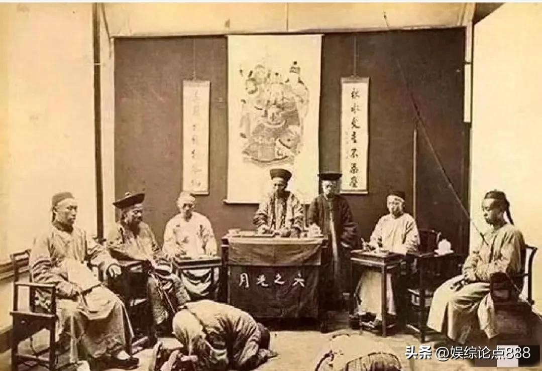 晚清审案现场,老爷端坐高台、威风凛凛,百姓卑微跪地,尽显封建等级落差。