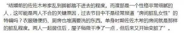 他们认为,渡部非常爱干净非常细腻,而佐佐木希婚前婚后都不怎么爱收拾房间,然后大概是这个原因,导致了渡部出轨。