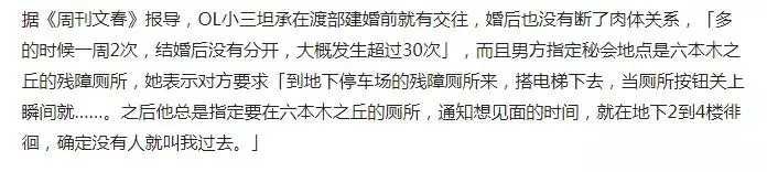 紧接着,某个女OL也站了出来爆料,说她和渡部在某大厦的厕所里面有过超30次的幽会……