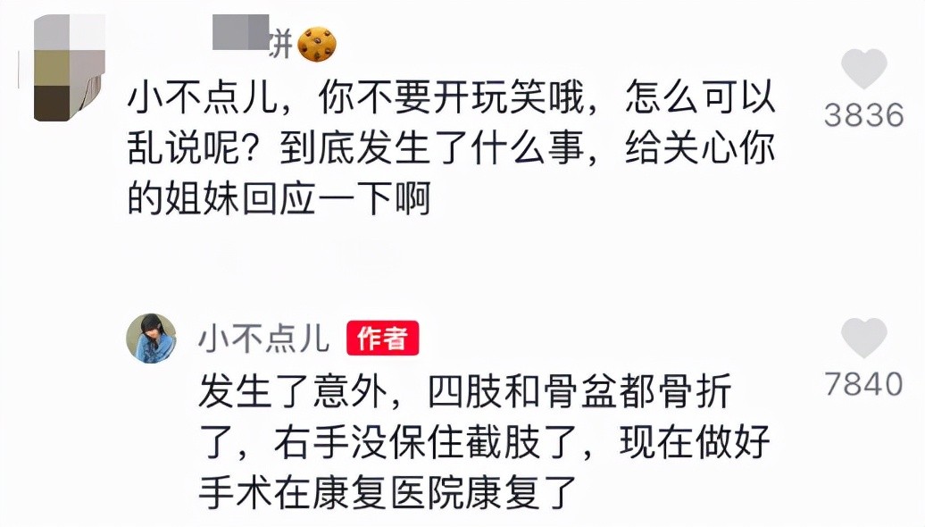 随后“小不点儿”解释说自己出了点意外导致四肢和骨盆骨折,右手没有保住截肢了,这段时间一直在医院休养。
