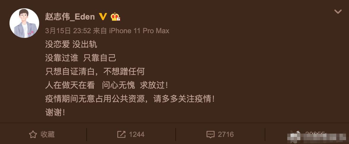 赵志伟发文否认与虞书欣恋情:没恋爱,没出轨,没靠过谁