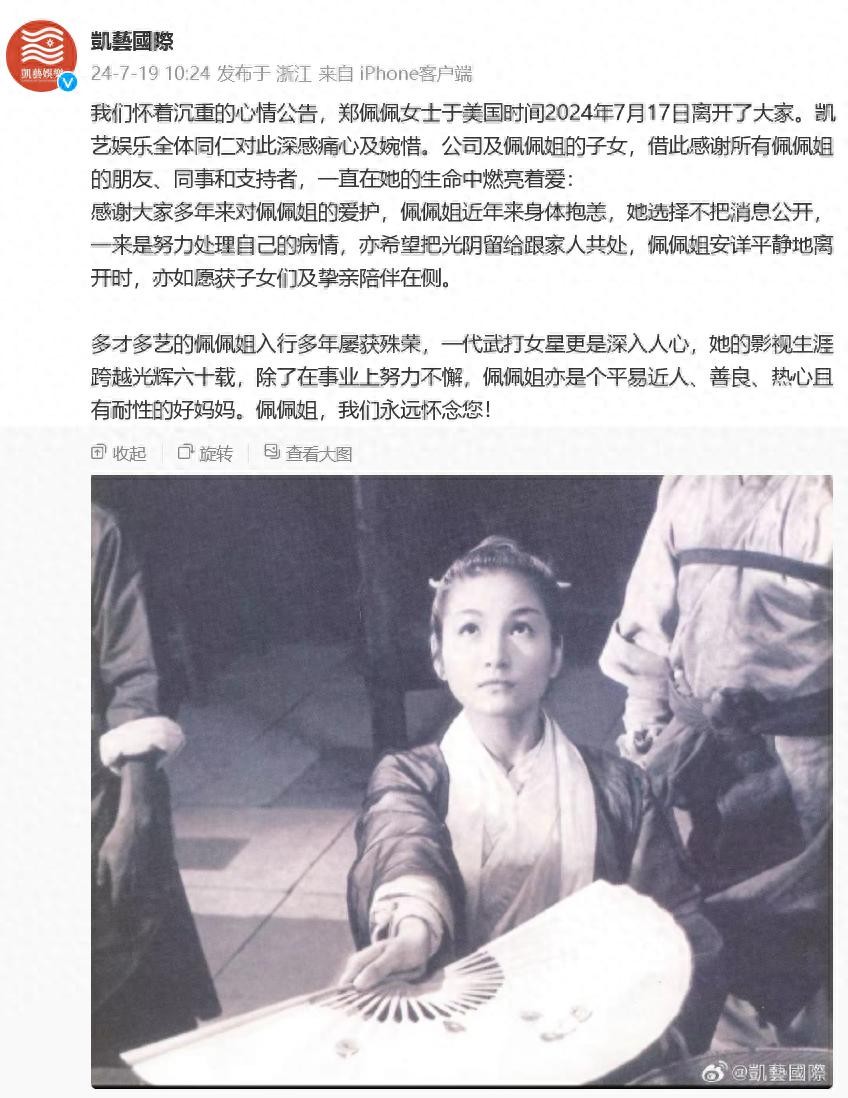 7月19日,经纪公司发文宣告知名演员郑佩佩于美国时间7月17日去世。