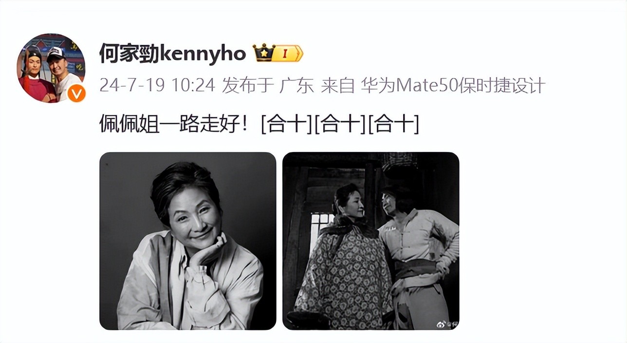 曾和郑佩佩合作《马永贞之英雄血》的演员何家劲晒昔日合作照悼念:“佩佩姐一路走好!”