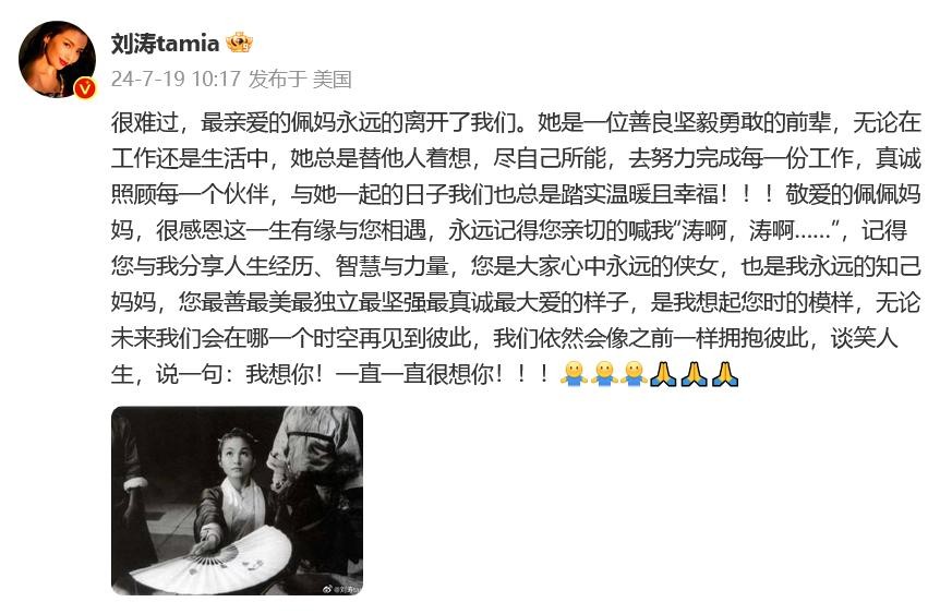 曾和郑佩佩一起录节目的刘涛发文:“很难过,最亲爱的佩妈永远的离开了我们。她是一位善良坚毅勇敢的前辈,无论在工作还是生活中,她总是替他人着想,尽自己所能,去努力完成每一份工作,真诚照顾每一个伙伴,与她一起的日子我们也总是踏实温暖且幸福!!!敬爱的佩佩妈妈,很感恩这一生有缘与您相遇,永远记得您亲切的喊我‘涛啊,涛啊……’,记得您与我分享人生经历、智慧与力量,您是大家心中永远的侠女,也是我永远的知己妈妈,您最善最美最独立最坚强最真诚最大爱的样子,是我想起您时的模样,无论未来我们会在哪一个时空再见到彼此,我们依然会像之前一样拥抱彼此,谈笑人生,说一句:我想你!一直一直很想你!!!”