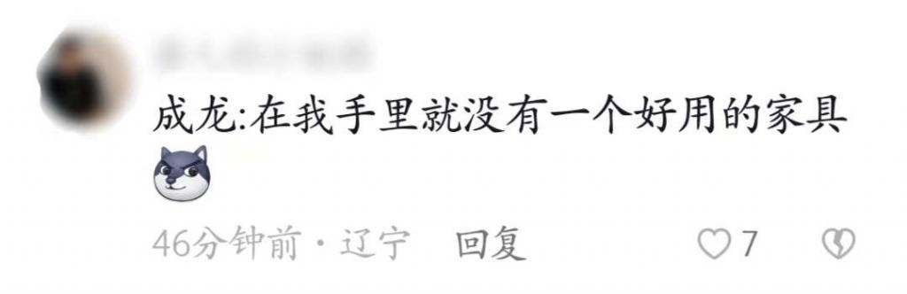 也有不少网友调侃道,果然什么家具在成龙大哥的手里都会坏,在成龙大哥的手里就没有好用的家具。因为在成龙大哥的电影中,家具对于他来说都可以轻轻松松拆开成为他的武器。