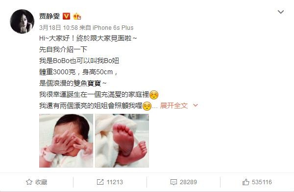 近日,台湾女星贾静雯生下第三胎女儿BOBO,引起了广大网友的关注。2005年06月19日,贾静雯为前夫孙志浩生下了第一个女儿梧桐妹。2015年8月14日,贾静雯为现任丈夫修杰楷生下了女儿“咘咘”!BOBO是她的第三个女儿,据报道,考虑到她的年纪,这也很可能是她所生最后一个女儿。