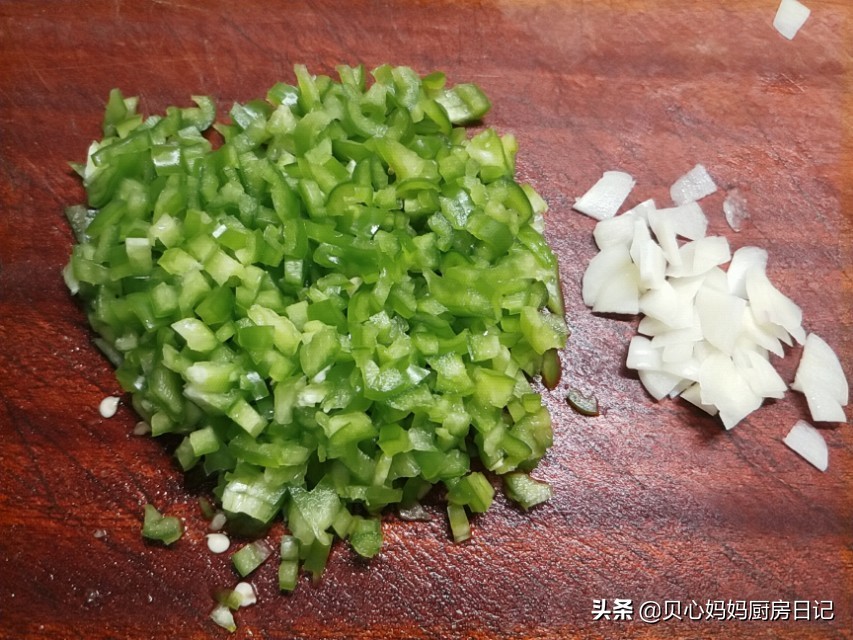 2、我加入的是青椒,若你想颜色更诱人,也可以加入少量胡萝卜或大红辣椒,这样颜色更丰富一些,只是千万别加多,不然吃起来就不是玉米粒,会少了那种粒粒爆浆的感觉了。
