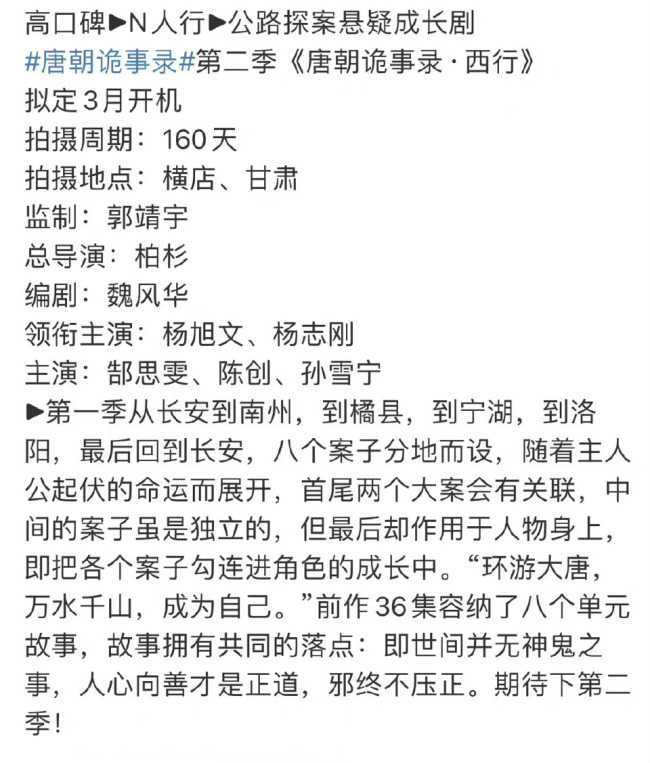 【求求幕后搞快点!搞快点!唐朝诡事录第二季将于三月开拍】唐朝诡事录第二季《唐朝诡事录·西行》即将开机,原班人马,3月开机,在横店、甘肃两地拍摄。拍摄周期160天。