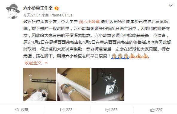 搜狐娱乐讯 3月31日晚,六小龄童工作室发布微博表示六小龄童患急性阑尾炎已住进北京某医院进行治疗,之后的签售活动也因此取消。照片中,六小龄童右手打着点滴,而左手则对着镜头竖起了大拇指。