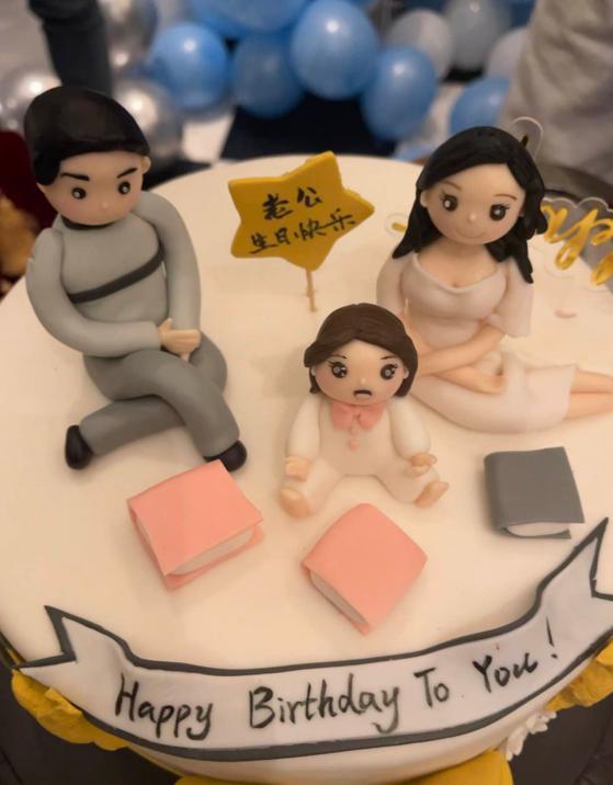 蛋糕上颖儿用心地写着“老公生日快乐。”他们一家三口无论是现实里的合照,还是蛋糕上的卡通人物合照,都看起来特别幸福,想必小宝贝在这样的环境中,也会成长得很好。