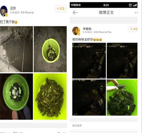 迟帅曾发两条微博,钓了两个钟、真的是自己钓的并配搞怪表情照。巧合的是凌晨12点时分,李璐茜也在微博上发博夜钓咪咪龙虾仔,也配图了,都是绿颜色的盛虾的桶。