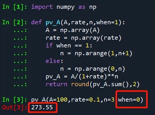 # ============================================================================= # # -*- coding: utf-8 -*- # """ # This is python program # Created on Tue Sep 21 10:02:42 2022 # @author: zgr # """ # A代表年金。如A=100。广播为每期现金流,可以每期不一样,如可以设为cashflow=[232,190,380,120,,,] # rate贴现率/利率。如rate=0.1。也可以每期不一样,如相应的,rate=[8%,6%,12%,10%,,,] # n为期数 # when=1表示现金流发生在期末,即普通年金。程序设定的默认值为1。 # when=0表示现金流发生在期初,即预付年金。 # 该段程序不仅仅是用来计算年金现值,如果把A设置为对应每期的现金流cashlow, # rate设置为对应期间的贴现率/利率,如:cashflow=[120,300,234,,,,] # rate = [0.1,0.12,0.08,,,,,]则程序就计算出对应的现值。 # ============================================================================= import numpy as np def pv_A(A,rate,n,when=1): A = np.array(A) rate = np.array(rate) if when == 1: n = np.arange(1,n+1) else: n = np.arange(0,n) pv_A = A/(1+rate)**n return round(pv_A.sum(),2) # when=0,先付,预付,即付; # when=1,后付,普通 pv_A(A=100,rate=0.1,n=3,when=0)
