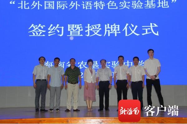 新海南客户端、南海网、南国都市报6月9日消息(记者 钟瑜)6月9日上午,海南省农垦实验中学与北京外国语大学国际教育集团在五指山市举行“北外国际外语特色实验基地”签约授牌仪式,双方将从外语教学、教师培训、拓展特色课程、英语阅读教学、国际测评等方面展开深度合作交流,在海南省中部地区打造外语特色鲜明的学校。