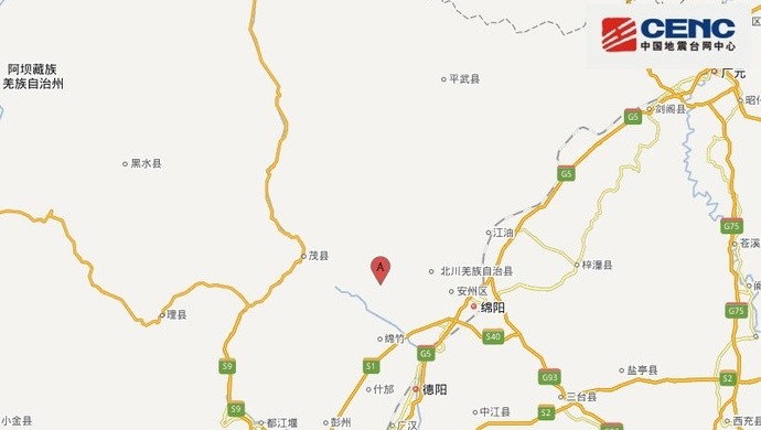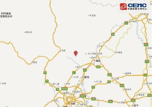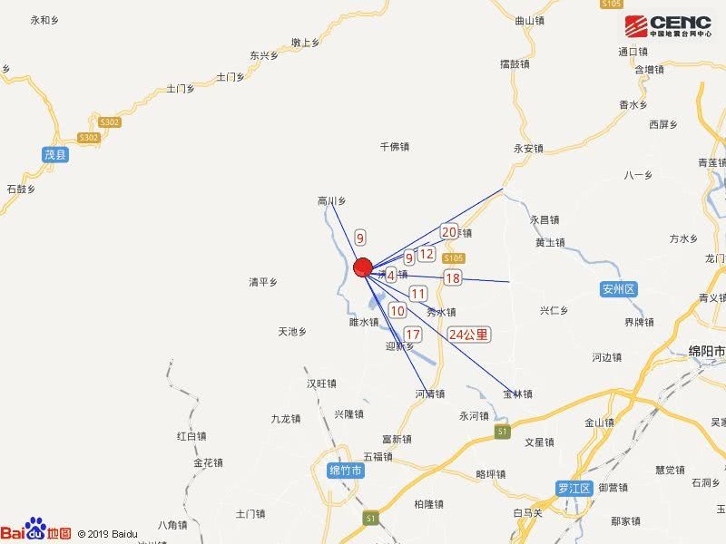 震中距绵竹市25公里,距北川县37公里,距茂县40公里,距绵阳市42公里,距成都市103公里。多位网友反馈,地震发生时,成都、德阳、广元等地震感明显。