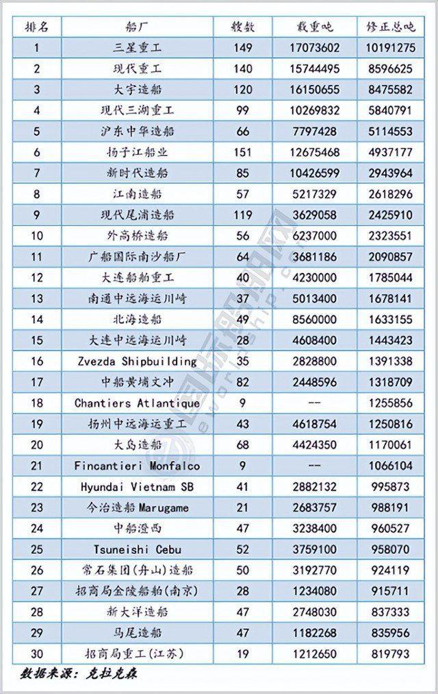 ▲全球手持订单量 Top30 船厂(按修正总吨),来源:克拉克森
