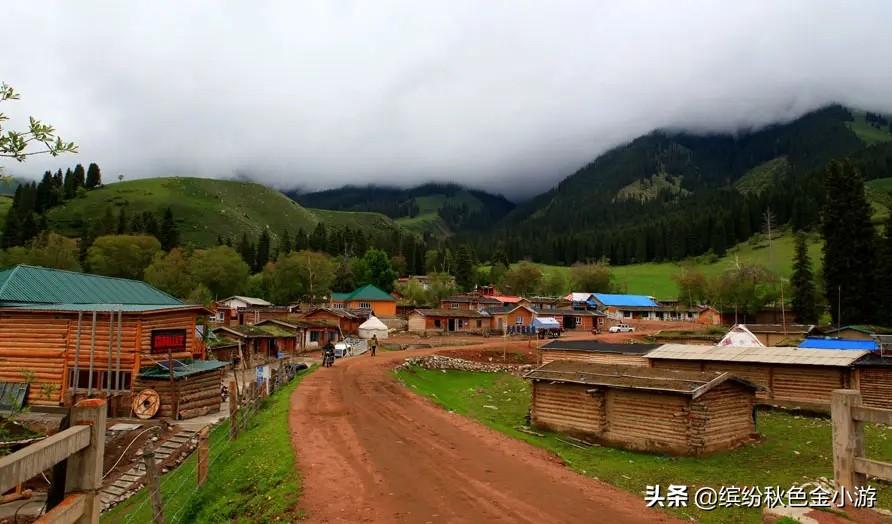 在琼库什台草原上的琼库什台村是个哈萨克牧民村庄,是天山半坡的一个小村,几乎所有的民房都是木建筑,有的房子用整根原木搭的,村庄四面环山,房屋依水而建,库尔代河流经此地。在很多游客心中这里就像是一个小瑞士。
