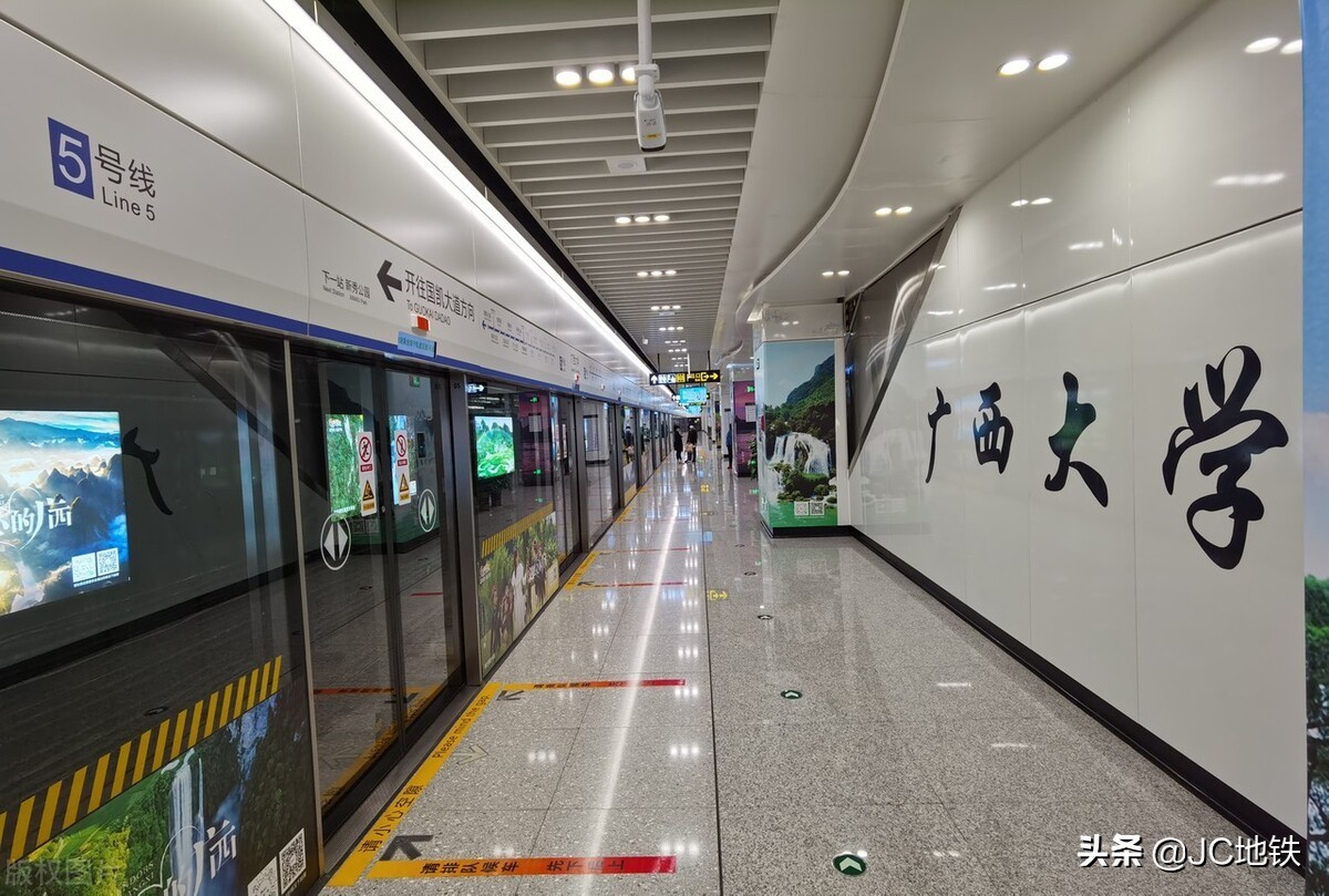 这次通车的5号线大概是“倒L”形的线路走向,与现有的1~4号线各有一次换乘,通达性不错,然后线路色采用了邕水蓝,颇有城市韵味。