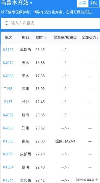 7.今日K4125 、K4012、K4008、 T198 、 Z137、 K4032 、K4630 、 K1538 、 K2060 、 K1504 、 K4544次11趟列车从乌鲁木齐发车,其中K4012、K4008、T198 、K4032 、K4630 、K1538 、2060 、 K4544次等8列为乌鲁木齐始发, K4125 、Z137次因时刻表未更新暂不清楚 , 这10趟专列目的地分别为成都、天水、郑州、长沙、济南、南京、重庆等7地。 K1504 次经停乌鲁木齐。