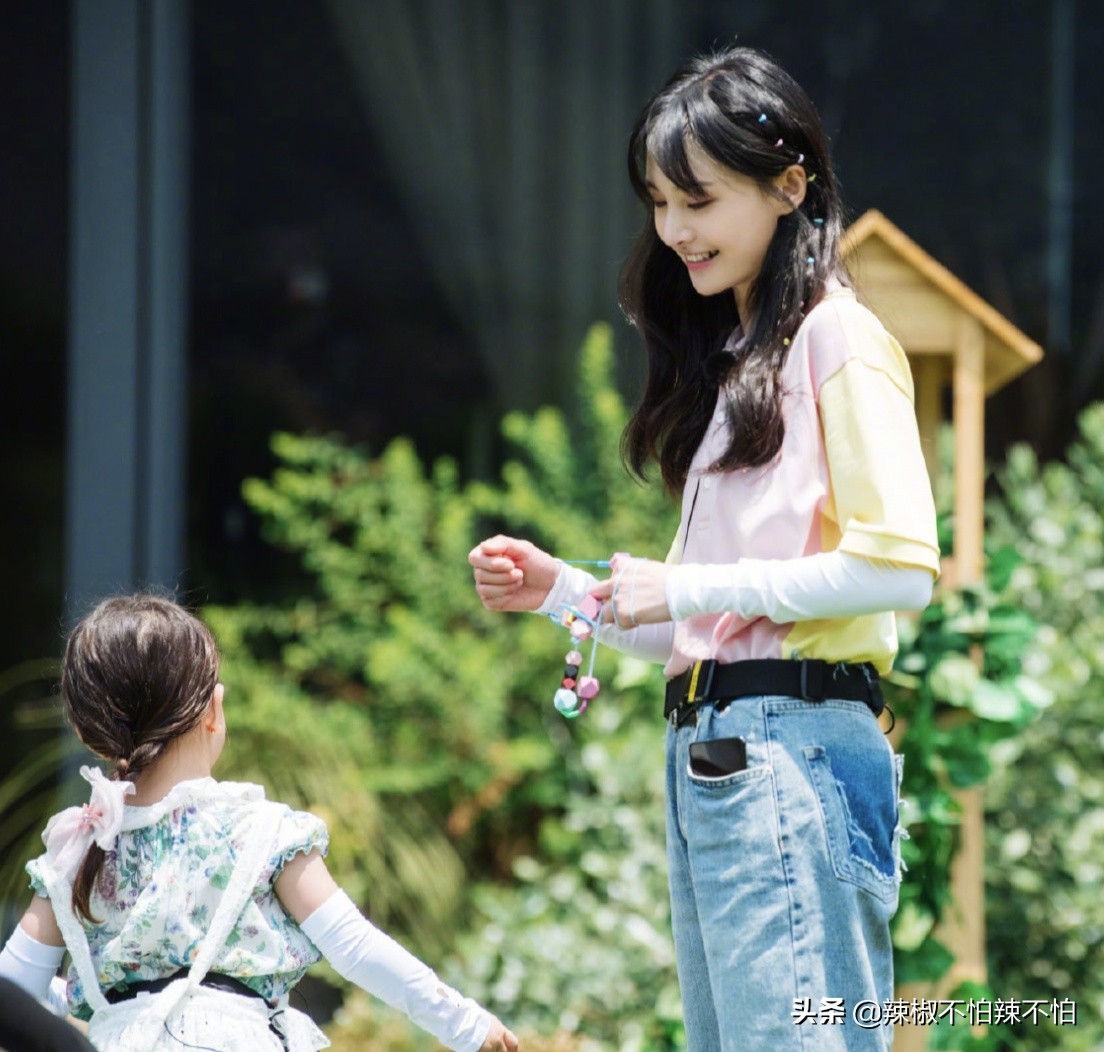 2、邻家小姐姐的造型也是甜到爆表!这一串五彩的发圈扎起来的这屡头发看起来俏皮可爱,话说小爽笑起来感觉太美好了~