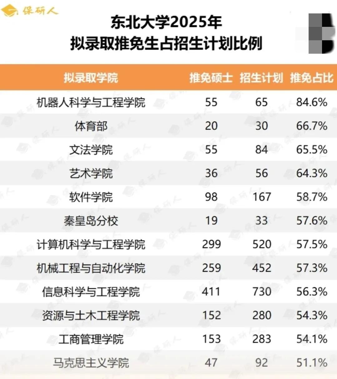 在接收硕士推免生的19个招生单位中,推免生占院系招生计划比例最高的是机器人科学与工程学院,比例达到84.6%;其次是体育部,推免生比例达到66.7%;第三是文法学院,推免占比达到65.5%,说明这些院系对于保研er给予了较大的上岸空间。材料科学与工程学院和冶金学院的推免生占院系招生计划比例最少,分别占21.0%和13.7%。,说明这两个学院给予保研er的上岸空间比较小,竞争比较激烈。