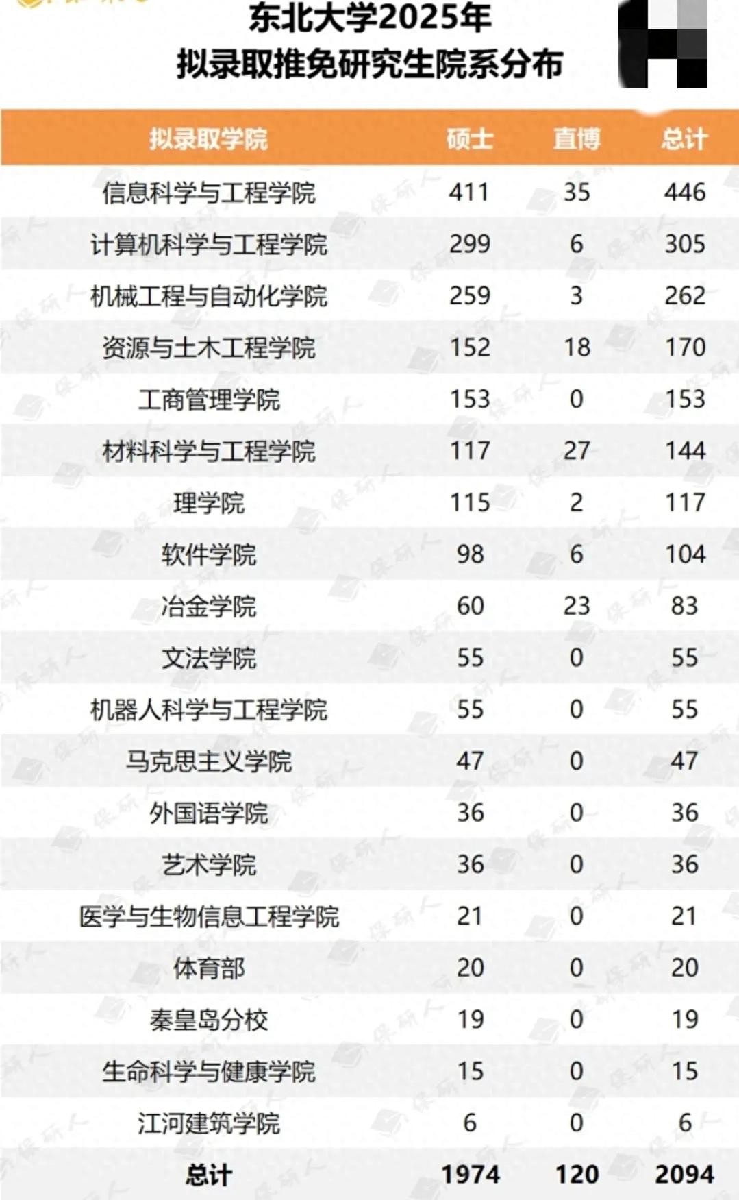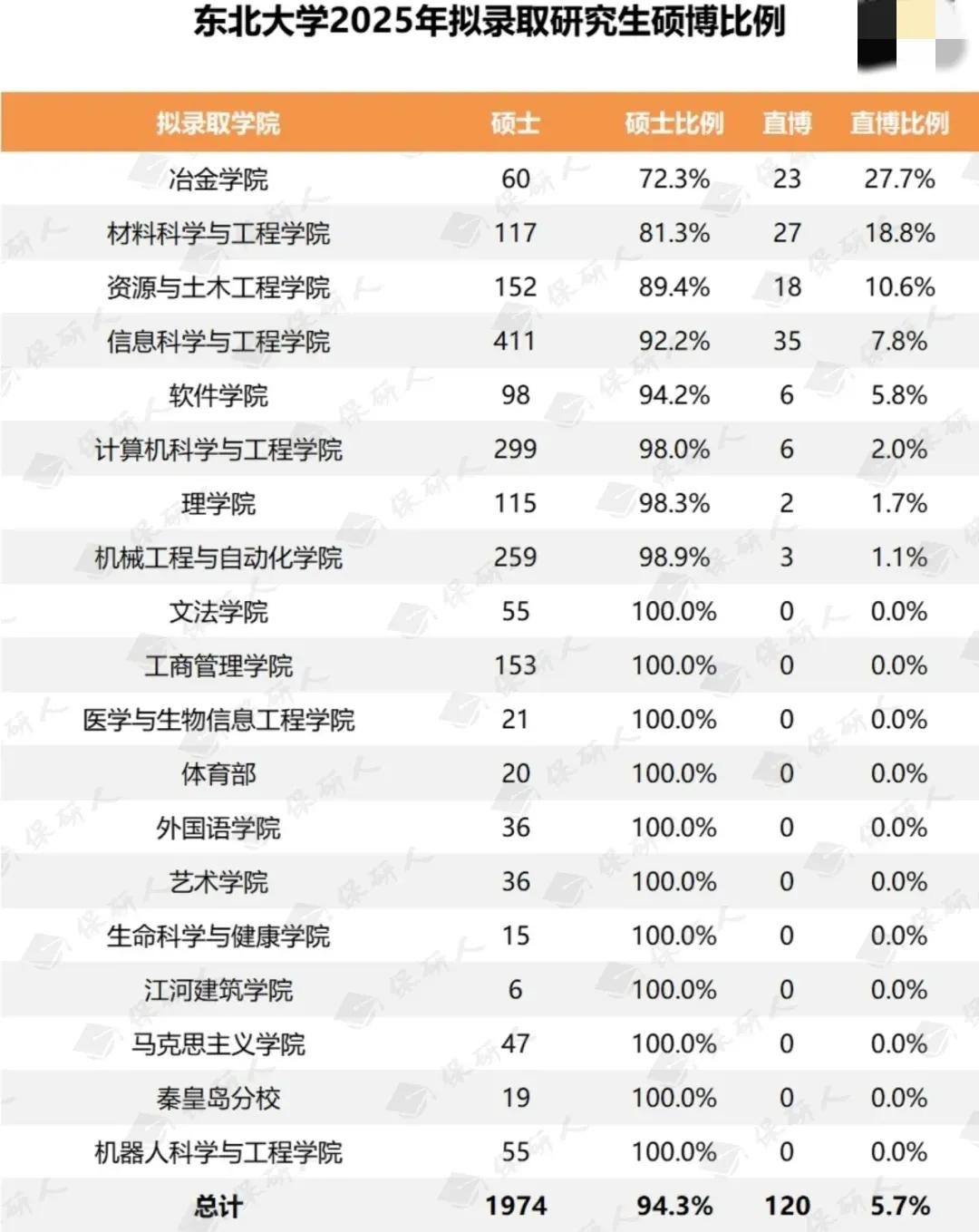 东北大学2025年共拟录取2094人,其中硕士推免生1974人,直博生120人。