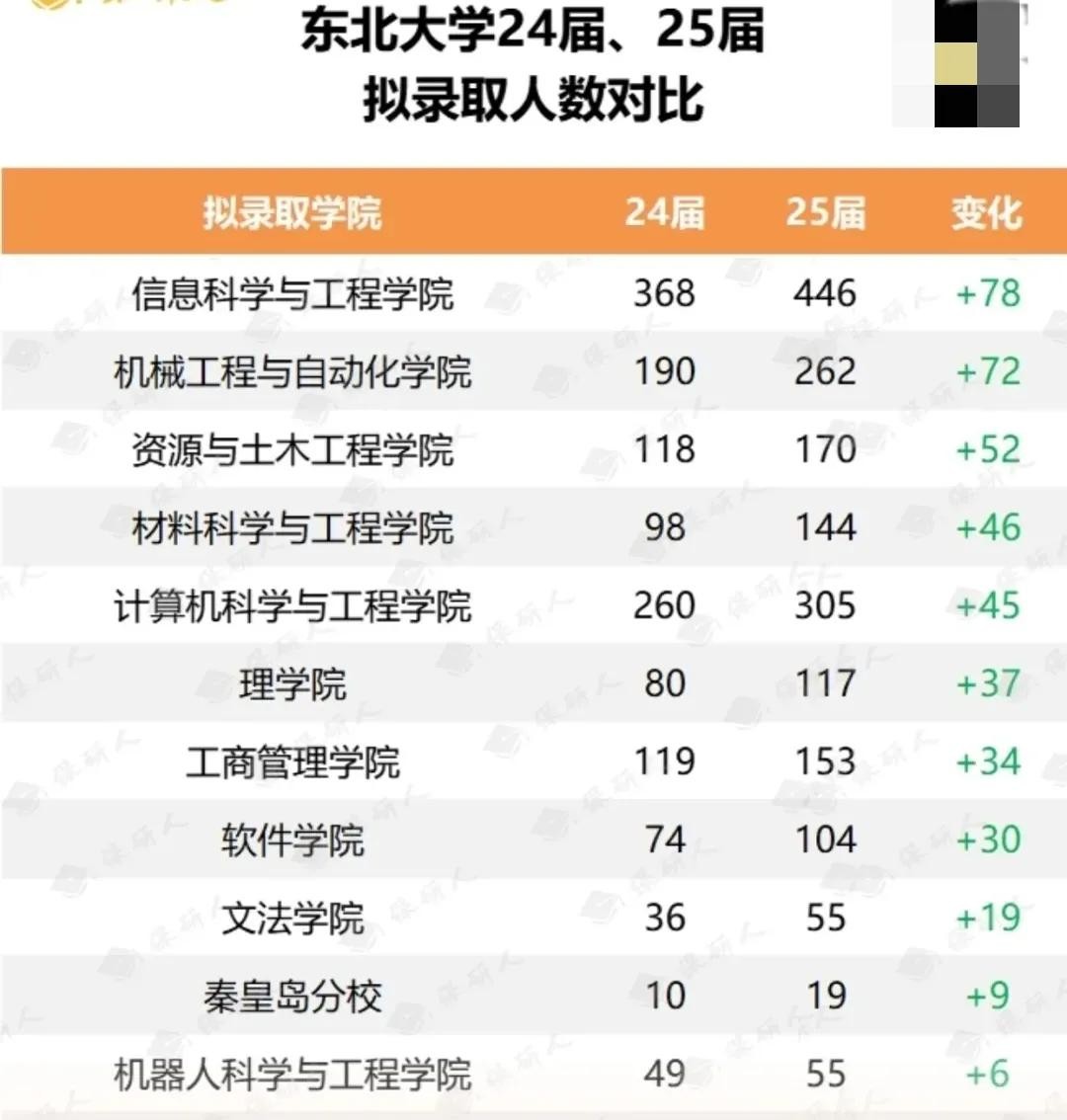从东北大学近两年的拟录取名单来看,东北大学25届比24届的拟录取人数增加了426人;其中共有15个招生单位出现扩招,扩招最多的是信息科学与工程学院,增加了78人,其次是机械工程与自动化学院,增加了72人;第三是资源与土木工程学院,增加了52人。有4个院系缩招,缩招最多的是医学与生物信息工程学院,减少了6人。(注:个别学院存在调整,无法对比招生变化情况)