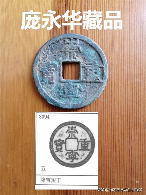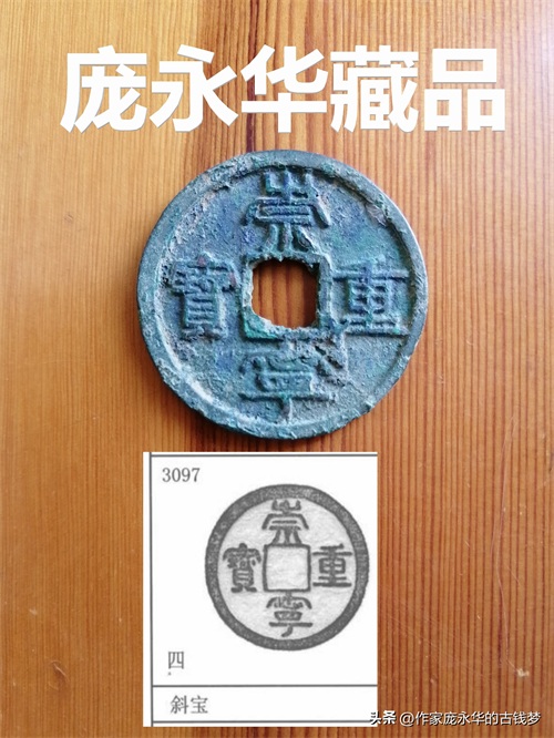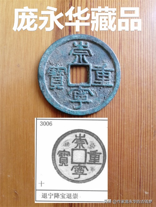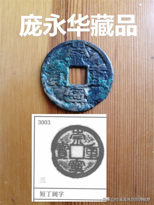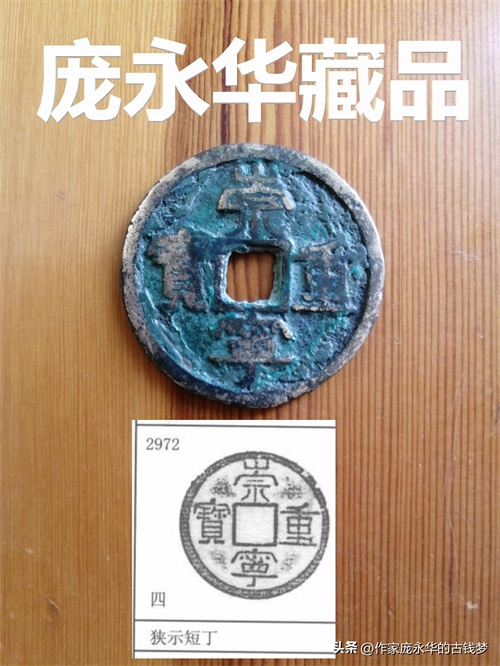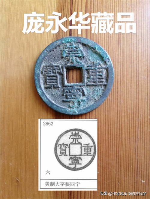 我收藏的这枚崇宁重宝,字为阔字,“宁”字“丁”部较短,属于短丁阔字版。在《北宋铜钱》一书里,短丁阔字版的编号为3003,属于3级币。小时候看到这枚崇宁重宝,我就感觉它与众不同,肯定是个特别版,所以一直精心保存着。