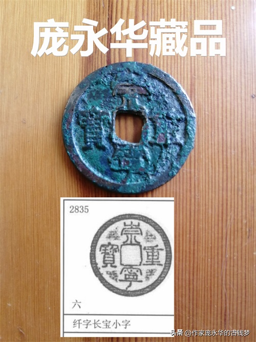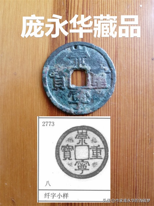 我收藏的这枚崇宁重宝,字体纤细,尺寸较小,属于纤字小样版。在《北宋铜钱》一书里,纤字小样版的编号为2773,属于8级币。