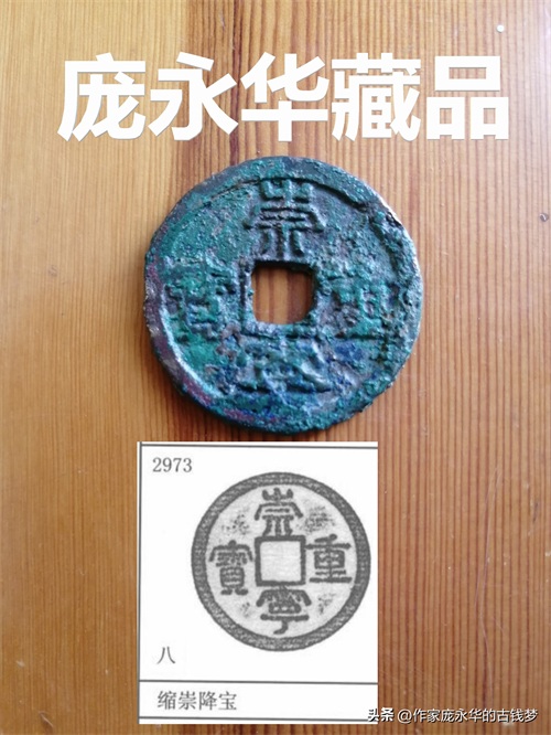 我收藏的这枚崇宁重宝,“崇”字紧缩,“宝”字下移,属于缩崇降宝版。在《北宋铜钱》一书里,缩崇降宝版的编号为2973,属于8级币。同样遗憾的是,这枚崇宁重宝的包浆也太厚重了,看上去同样的丑。
