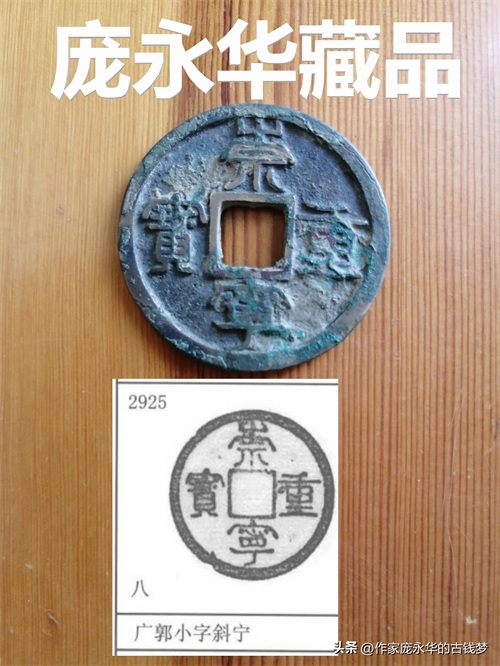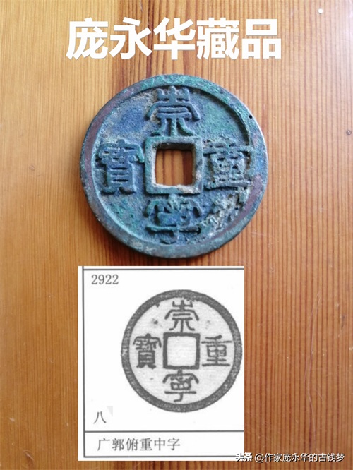 我收藏的这枚崇宁重宝,郭为广郭,字为小字,“宁”字倾斜,属于广郭小字斜宁版。在《北宋铜钱》一书里,广郭小字斜宁版的编号为2925,属于8级币。