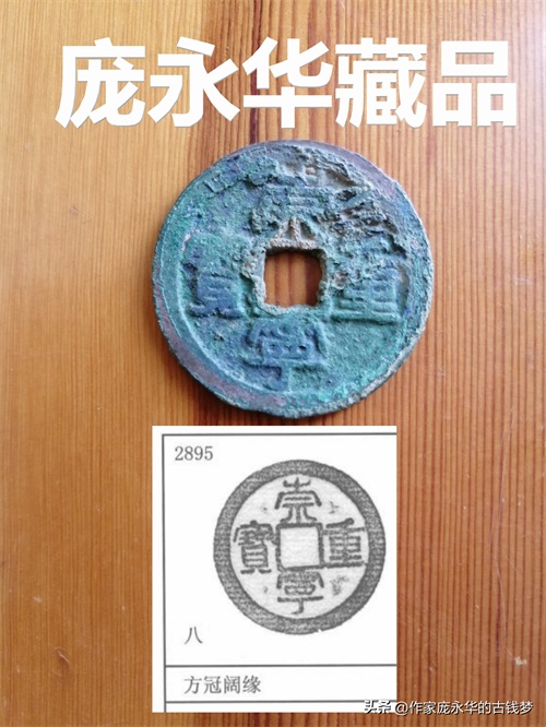 我收藏的这枚崇宁重宝,冠为方冠,缘为阔缘,属于方冠阔缘版。在《北宋铜钱》一书里,方冠阔缘版的编号为2895,属于8级币。所谓方冠,就是“崇、宁、宝”三字的宝盖头都很方正,方折近乎直角。