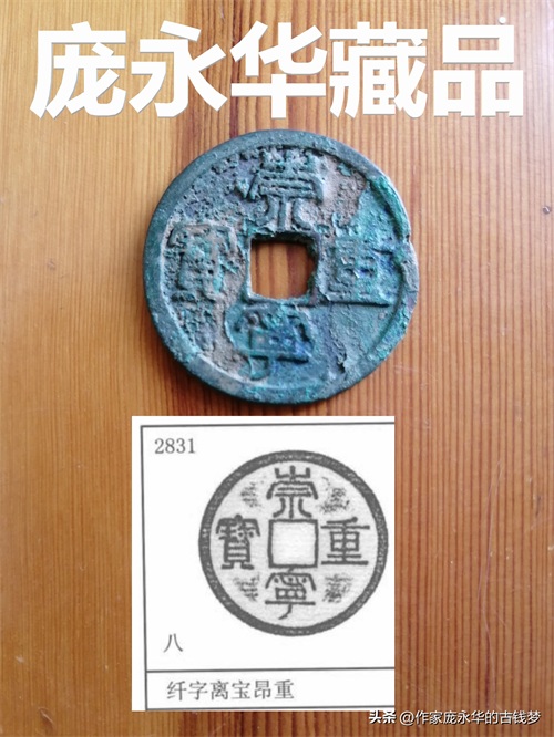 我收藏的这枚崇宁重宝,字体纤细,“重”字上移,“宝”字离郭较远,属于纤字离宝昂重版。在《北宋铜钱》一书里,纤字离宝昂重版的编号为2831,属于8级币。