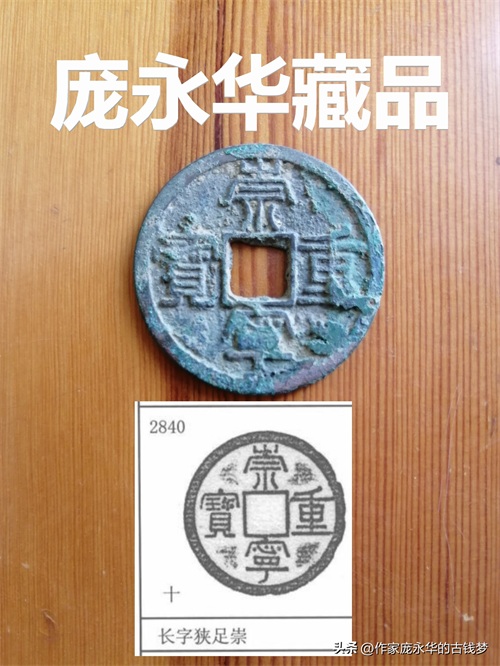 我收藏的这枚崇宁重宝,字为长字,“崇”为狭足崇,属于长字狭足崇版。在《北宋铜钱》一书里,长字狭足崇版的编号为2840,属于10级币。所谓长字,就是钱文四字较长,尤其“重、宝”两字,并且字形是上下长方形的;所谓狭足崇,就是“崇”字纤细,给人门缝一样的狭小感,尤其下半部分的“示”字更狭。