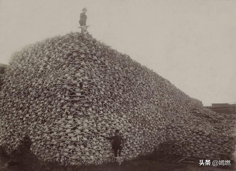 27 21.1879年代,美国某处地方堆积如山的北美野牛头骨。北美野牛在北美州繁衍了很多年,数量达7000万头,遍布整片大陆,但是自从美国人来到以后,北美野牛就遭到灭顶之灾,不断遭到屠戮,数量一度下降到不足1100头。直到1905年野牛近乎灭绝的情况下,美国总统罗斯福颁布法令,将野牛等一批珍稀动物列为保护动物,野牛才得以留存下来。