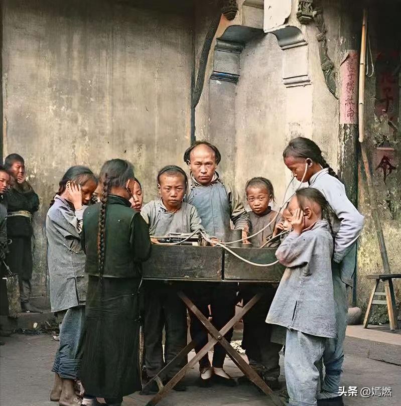 02 在街边一个拐角处,一群孩子围在一起。他们面前的桌子上,摆放着两个木质的盒子。这其实是两台留声机。