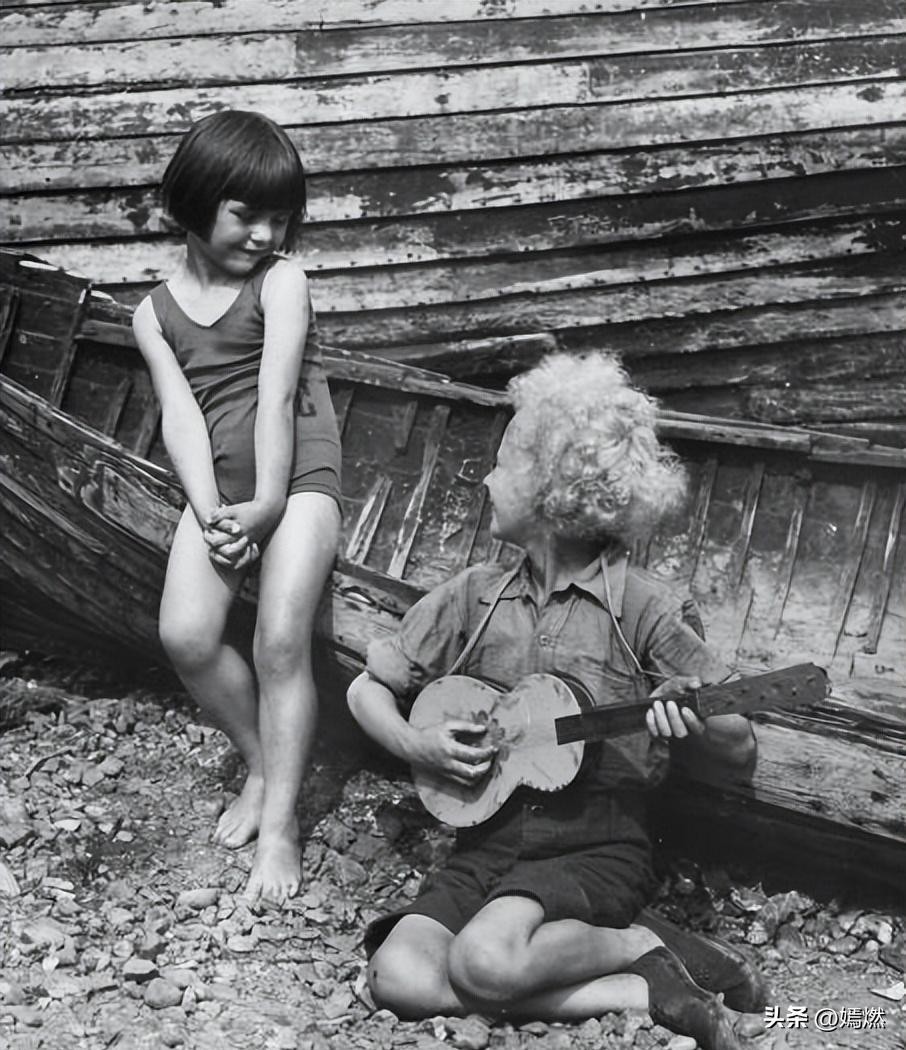 22 1932年,在肯特郡克里夫顿维尔的一处海滩上,一位小男孩,怀里抱着一把乐器,正面露微笑地看着身边的小女孩,他们一起靠在一艘破旧的小船上,小男孩演奏着乐曲,眼中满是笑意,小女孩则是一脸羞涩地坐在一旁,静静地欣赏着男孩弹奏的乐曲。