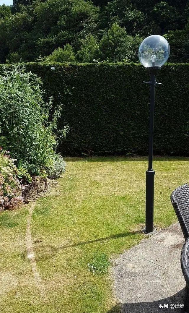 11 安装在草地旁边的路灯,透明的灯罩在太阳光的作用下形成了一个焦点,慢慢的在草地上划出了一条规则的曲线