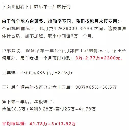 从上面看,一台吊车一年盈利13.92万,看着还不少,但是这只是理想状态下的,保证一年365天不休息,吊车款可以每个月收到的情况下,不出事故,不出重大车损的情况下,吊车是高风险作业,能保证这些还是不容易的。(这是珊珊按比较理想的状态粗略算了一下,有什么不对,请各位吊友指正)