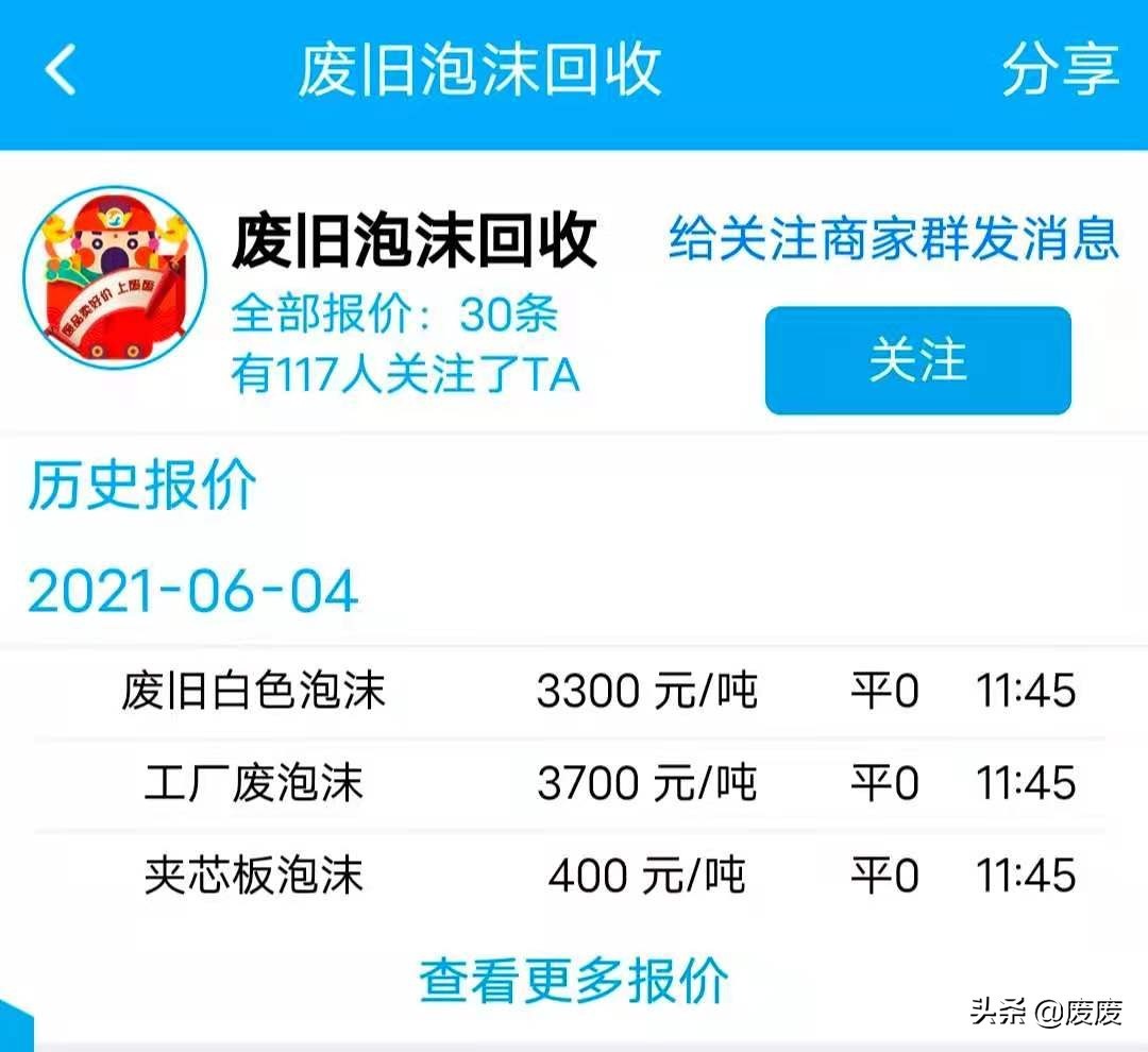 目前,市场上的普通废旧泡沫收购价格在每斤3毛左右,下面是废废商户报价中有关废旧泡沫回收的价格,可以看出,废旧白色泡沫和工厂废旧泡沫的回收价格都在三千多元每吨。